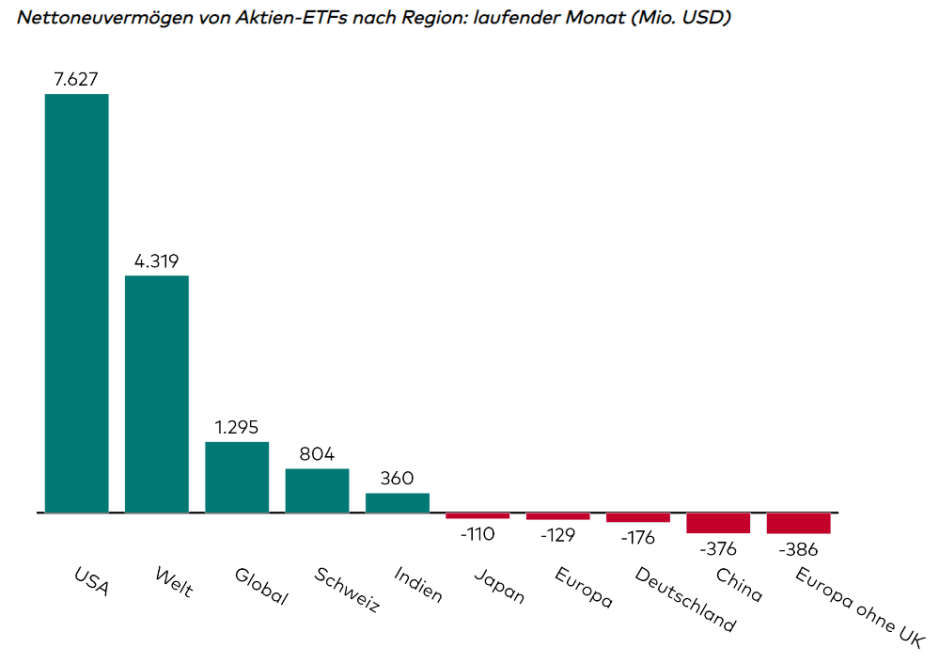 Mit Zuflüssen in Höhe von 7,6 Mrd. USD führten US-Strategien das Aktiensegment an, gefolgt von Welt-Exposures (ohne Schwellenländer) mit einem Plus von 4,3 Mrd. USD. Mit Abflüssen in Höhe von 386 Mio. USD bildeten ETFs auf europäische Aktien (ohne Großbritannien) im November das Schlusslicht.