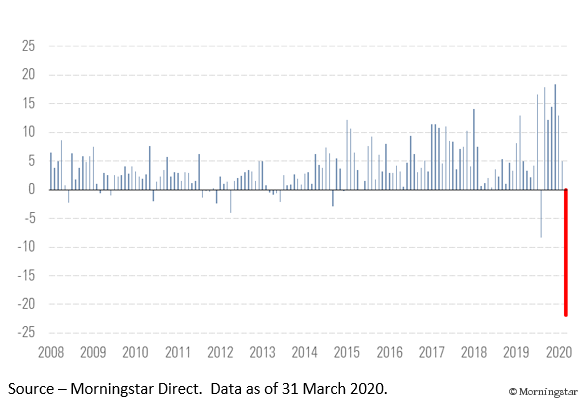 Die Börse wird bekanntermaßen von Angst und Gier regiert. Im März hielt zweifellos die Angst das Zepter in der Hand. Das blieb auch für die ansonsten erfolgsverwöhnte ETF-Branche nicht ohne Folgen. Panische Anleger gaben im März ETF-Anteile im Wert von 21,9 Milliarden Euro zurück. Aktien- und Anleihe-ETFs verloren jeweils rund 13 Milliarden Euro. Dass der Nettoverlust keine 26 Milliarden Euro beträgt, liegt allein an den hohen Netto-Zuflüssen in Geldmarkt-ETFs.