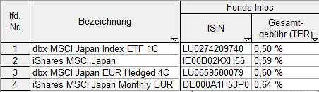 Interessant ist ein Performancevergleich der gehedgten ETFs mit denen, die nicht gegen Währungsrisiken abgesichert sind: Der DB X-Trackers MSCI Japan Hedged Equity Fund steigerte seinen Wert im ersten Halbjahr um 31,84 Prozent. Sein ungesichertes Pendant, der DB X-Trackers MSCI Japan Index ETF (ISIN: LU0274209740) erreicht dagegen ein Plus von 17,68 Prozent. Der iShares MSCI Japan Monthly Euro Hedged performte im selben Zeitraum mit 33,51 Prozent. Der iShares MSCI Japan (ISIN: IE00B02KXH56) kommt auf 18,47 Prozent. Für die Währungssicherung müssen Anleger jedoch einen Aufschlag bezahlen: Während die ungehedgten ETFs Total Expence Ratios von 0,5 Prozent (DB X-Trackers) und 0,59 Prozent (iShares) aufweisen, liegt die Gebühr der abgesicherten Produkte bei 0,6 Prozent (DB X-Trackers) und 0,64 Prozent (iShares).