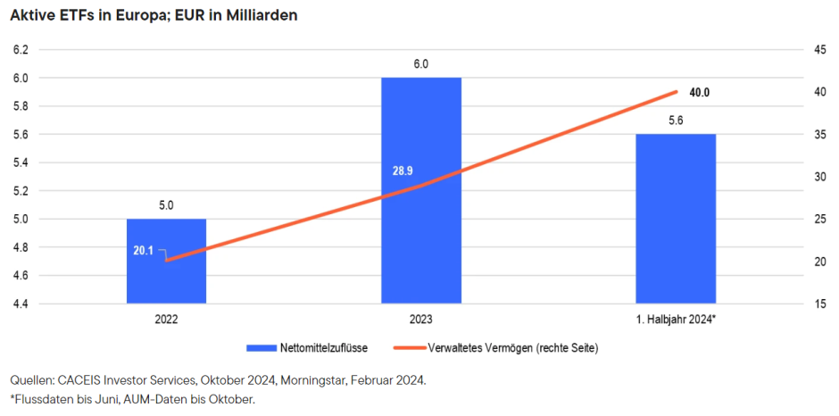 Das Wachstum aktiver ETFs zeigt sich in der raschen Ausweitung der Angebote durch große Vermögensverwalter, teilweise getrieben durch einen hochgradig wettbewerbsintensiven Markt. Da die Gebühren im passiven ETF-Sektor weiter sinken, wenden sich Vermögensverwalter aktiven ETFs als Differenzierungsmerkmal zu. Etwa die Hälfte der ETF-Emittenten in Europa bietet nun aktiv verwaltete ETFs an. Von fast 2.000 ETFs sind laut Bloomberg etwa 120, also 6 %, als aktive ETFs gelistet. Die Aussichten für aktive ETFs sind positiv und für die nächsten zehn Jahre wird ein erhebliches Wachstum erwartet. Eine zunehmende Akzeptanz durch institutionelle Investoren, die von der Liquidität und Kosteneffizienz von ETFs angezogen werden, ist ein Trend, der diese Expansion unterstützt. Für institutionelle Portfolios ist die Möglichkeit, aktiv verwaltete Komponenten zu integrieren, ohne Transparenz oder Kostenkontrolle zu beeinträchtigen, sehr überzeugend.