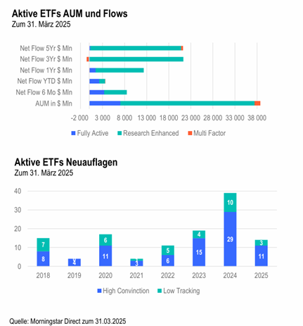 Aktive ETFs verzeichneten 2025 die höchsten Zuflüsse aller Zeiträume. Im ersten Quartal entfielen rund 8 % aller Nettozuflüsse auf aktive Strategien, obwohl diese nur 2,5 % des Gesamtmarktes stellen. Besonders erfolgreich waren vollständig aktive Aktien-ETFs mit hohem Überzeugungsgrad („High Conviction“), die allein 63 % der YTD-Zuflüsse auf sich vereinten.