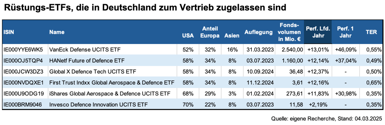 Im Kontrast dazu setzen der iShares Global Aerospace & Defence UCITS ETF und der Invesco Defence Innovation UCITS ETF mit einem Anteil von knapp unter 70 Prozent Portfolioanteil vor allem auf die Performance von US-Rüstungsunternehmen. Ob es eine gute Idee ist, darauf zu wetten, ist muss sich noch zeigen. Denn von den bisherigen Unterstützungsmaßnahmen für die Ukraine haben vor allem US-Unternehmen profitiert. Diese Aufträge sind nun hinfällig. Dazu kommt, dass Donald Trump angekündigt hat, den US-Militärhaushalt in den kommenden Jahren drastisch zurückzufahren. Gleichzeitig ist es kaum vorstellbar, dass Europa jetzt ausgerechnet in den USA für viel Geld Waffen einkauft. Man wird die eigene Rüstungsindustrie stärken wollen. Auch das dürfte den Konzernlenkern in den Zentralen von RTX, Boeing oder Northrop Grumman Kopfzerbrechen bereiten.