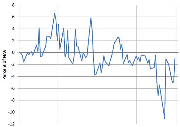 Die Grafik zeigt die Differenz zwischen den Börsenpreisen und den jeweiligen NAVs des SPDR Barclays High Yield Bond ETF (Bloomberg Ticker JNK) und des iShares iBoxx High Yield Corporate Bond ETF (Bloomberg Ticker HYG). D.h. wenn beide ETFs um den gleichen Wert von ihrem NAV abweichen, dann ist die Differenz Null. Da es sich um vergleichbare High Yield Fonds handelt, würde man erwarten, dass die Abweichungen gleich stark sind bzw. in die gleiche Richtung gehen und somit die Differenz sehr klein ist. In diesem Vergleich zwischen diesen beiden sehr ähnlichen High Yield Fonds (beide halten ähnliche Titel) schwankt die Differenz der Preise zu ihren NAVs jedoch zwischen +7% und -11% innerhalb von 4 Tagen. Die Abweichungen belegen also, dass die Preisveränderungen am Sekundärmarkt nicht durch die entsprechenden Transaktionen auf dem Primärmarkt ausgeglichen werden können um den Börsenpreis nahe dem NAV zu halten.