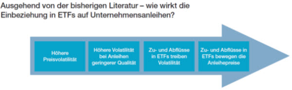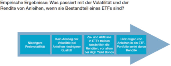 Demnach sei die Volatilität bei Anleiherenditen, die in einem ETF gehalten wurden, niedriger als bei solchen, die es nicht waren. Dies gelte auch für Anleihen von geringerer Qualität (High Yield). Jedoch treiben Zu- wie Abflüsse die Volatilität der Anleihepreise. Weiterhin wurde die Aufnahme von Anleihen in einen ETF mit anschließend niedrigeren Renditen beobachtet.