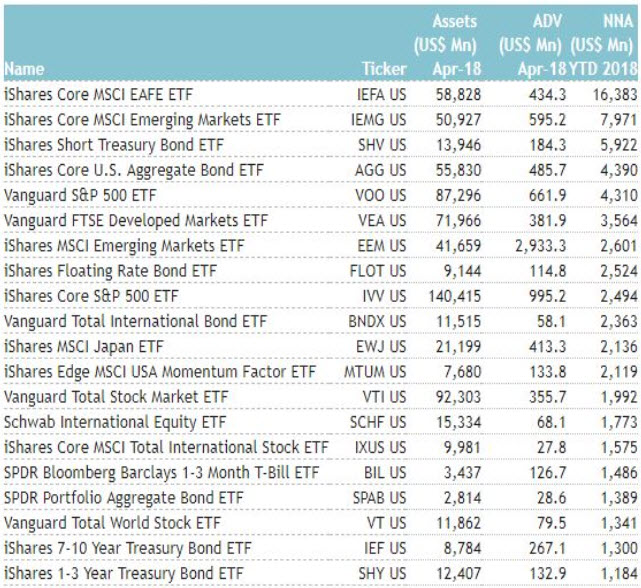 Den Großteil der Zuflüsse teilen die Branchenriesen unter sich auf. Unter den Top-Ten Fonds landen sieben BlackRock-Fonds und drei Vanguard-ETFs. Der größte Fonds ist mit AuM von 140.415 Mrd. US-Dollar der ishares Core S&P 500 ETF. Auf Rang zwei bis vier folgen ebenfalls Indexfonds der BlackRock-Gruppe. Mit einem Volumen von 92.303 Mrd. folgt der Vanguard Total Stock Market ETF auf Rang zwei.
