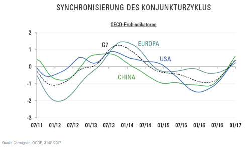 Die tiefgreifende Unzufriedenheit in Teilen der westlichen Demokratien zeigt, dass wirtschaftliche Folgen der Globalisierung unbedingt im Zaum gehalten werden muss. Aber in seiner Kritik des Freihandels irrt der Populismus, wenn er das globale Wachstum und den Handel der Länder untereinander als Nullsummenspiel ansieht, aus dem er durch Ausnutzung des Kräfteverhältnisses als Sieger hervorgeht. Die USA mögen zeitweise behaupten, sie seien überlegen. Doch gegenüber China dürfte sich ein solcher Ansatz allerdings schnell als vermessen herausstellen. Wie kann man übersehen, dass kein Land Europas durch Isolationismus gestärkt wird? Vor allem Frankreich braucht heute seine Partner im Ausland, die seine Exporte kaufen und sein Außenhandelsdefizit finanzieren. Es wäre eine besondere Ironie, wenn Europa ausgerechnet dann der Verlockung des Populismus verfallen würde, wenn sich der Konjunkturzyklus endlich wieder erholt und Deutschland und Frankreich kurz davor stehen, ihre Wirtschaftsleistungen zu einer unverzichtbaren Konvergenz zu vereinen. Anleger wären mehr denn je gut beraten, sich vor politischem Risiko zu hüten, um die zahlreichen Chancen zu nutzen, die sich auf lange Sicht ergeben.