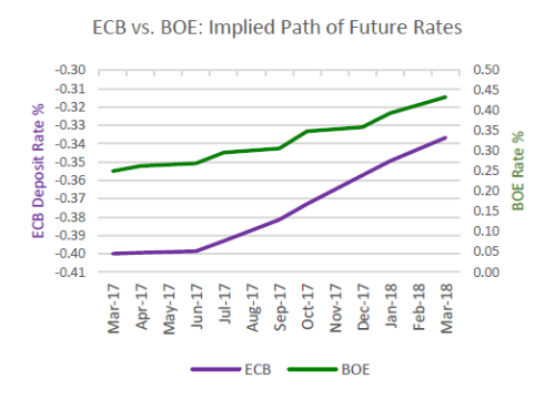 Not So Obvious: If a hard Brexit is the current conventional wisdom, then the trade du jour is short GBP. This view, however, is probably too simple. Again, markets to somedegree have already begun to adjust to the new potential downside outcomes since the referendum last June. From pre- referendum levels, the British pound is already down 11% and16% against the euro and U.S. dollar, respectively, and down 13% on a trade-weighted basis. Trade flows may be hampered somewhat, but WTO tariff levels vary widely by industry, so the recent depreciation of the pound may already alleviate some of this pain. Outside of trade dynamics, it is hardly clear that GBP will depreciate significantly as the outlook for growth and real interest rate differentials between the UK and Euro zone remains murky. (Forecast growth rates for real GDP in the Euro zone and the UK are both around +1.5% for the next several years, while both the ECB and BOE are likely to contemplate reducing policy accommodation in early 2018.) If negotiations turn ugly, additional GBP depreciation could occur, but we don’t think this should be a foregone conclusion.