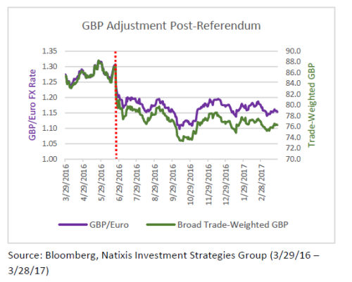 Alpha over Beta: As for the equity market, UK stocks have struggled since the referendum on a local currency (GBP) basis returning less than 1% while the U.S. (S&P 500®) and Europe (MSCI Europe ex-UK) have returned approximately 13%. Relative valuations based on forward earnings estimates are broadly in line with the rest of Europe; both look somewhat cheaper than U.S. stocks reflecting Brexit fears as well as broader political fears across Europe. However, as we’ve been saying for some time, few equity markets are cheap on an absolute basis. The equity story of Brexit may be more about alpha – security-specific opportunities – than beta. The details that emerge from the negotiations are likely to create distinct winners and losers in the UK economy and stock market. These include financial service companies dependent on future passporting restrictions, labor-intensive industries reliant on access to EU workers, and export-heavy firms subject to the new trade regime and FX fluctuations. For equity investors, these micro factors are likely to have an outsized effect on corporate performance leading to increased dispersion among the stocks in the indexes – and opportunities for active managers.