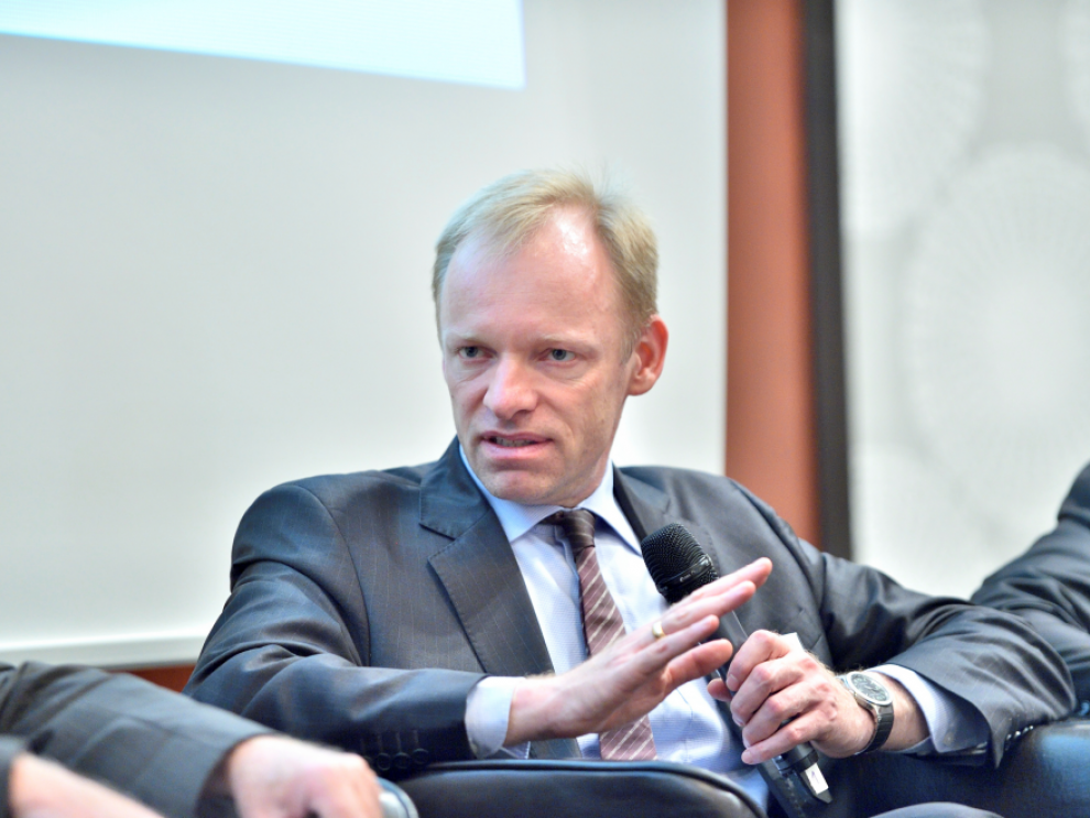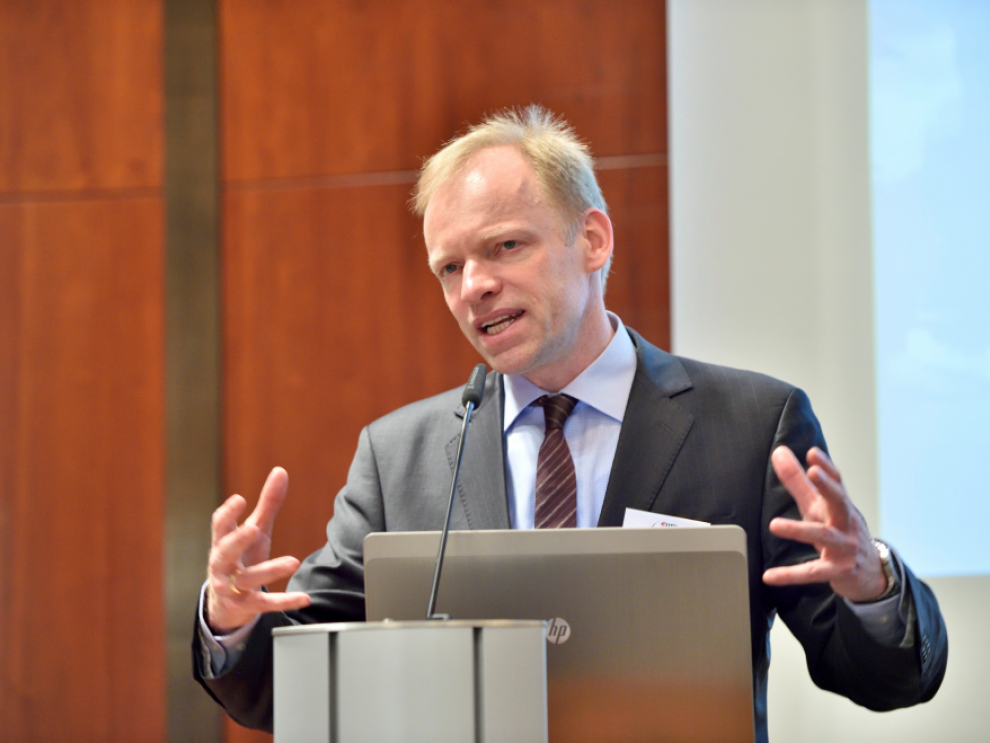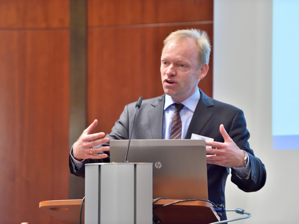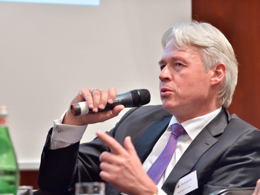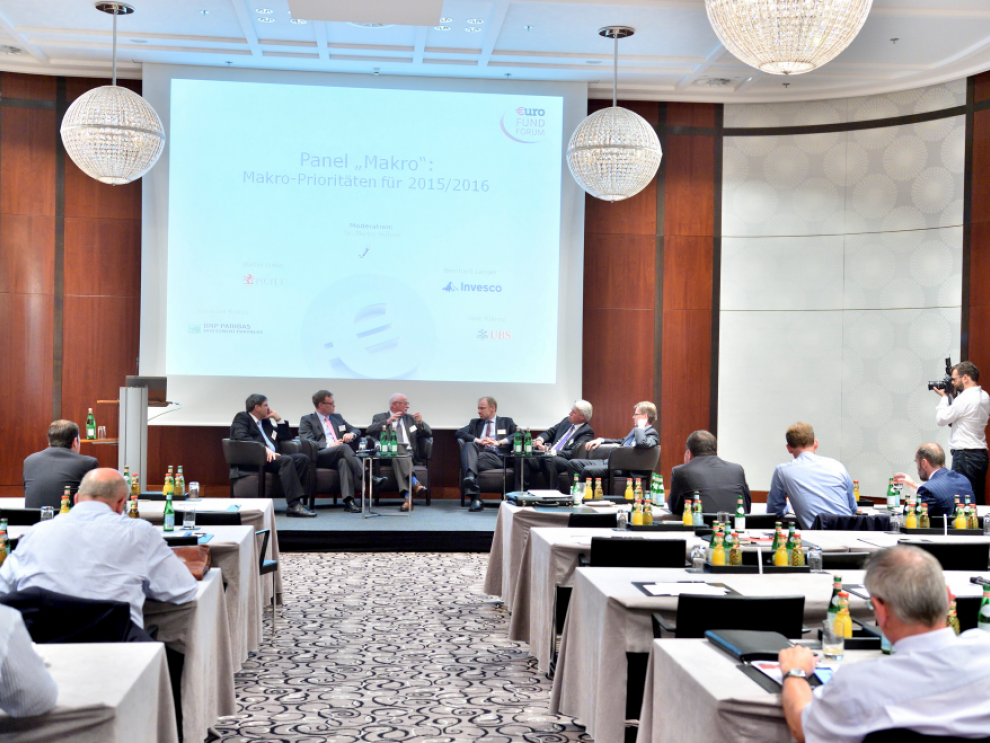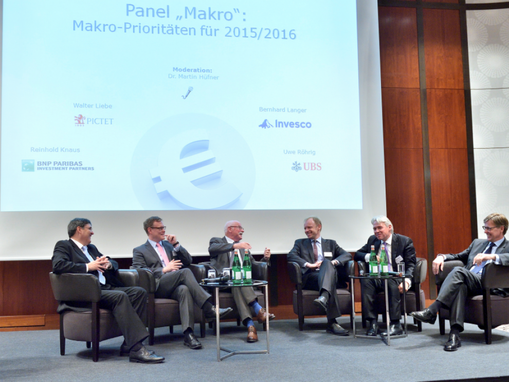 Im Anschluss an den Vortrag moderierte Martin Hüfner, Chefvolkswirt bei Assenagon Asset Management, das Panel „Makro“ und diskutierte mit Clemens Fuest, Reinhold Knaus von BNP Paribas, Bernhard Langer von Invesco, Walter Liebe von Pictet und Uwe Röhrig von UBS über die „Makro-Perspektiven 2015/2016“. Hierbei wusste Invesco-Mann Langer zu überraschen: „Wir rechnen damit, dass die Fed eine Zinserhöhung weiter vertagt und in diesem Jahr nichts mehr passiert.“ Diese Meinung hatte er exklusiv. Tragisch sei dies aber nicht, so Langer. „Die Märkte würde eine spätere Zinsanhebung nicht stören, die US-Wirtschaft läuft schließlich.“ Dass ein späterer Zinsanstieg für die Märkte durchaus von Vorteil wäre, glaubt auch Reinhold Knaus von BNP Paribas. Doch der Volkswirt warnt: „Da eine Zinsanhebung noch in diesem Jahr von allen Seiten erwartet wird, könnte sich bei Nichtstun Unsicherheit an den Märkten breit machen.“ „Die Fed soll die Kuh endlich vom Eis bringen“, fordert Uwe Röhrig von der UBS. Er rechnet genau wie Pictet-Experte Walter Liebe und auch Knaus mit einer Zinsanhebung im Herbst 2015.
