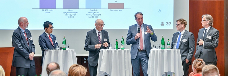 Martin Hüfner, der die Diskussion leitet, eröffnet die Runde mit einer Umfrage ans Publikum: Wo steht der DAX am Jahresende? Wenig überraschend erwarten die meisten Teilnehmer, dass der DAX in einem halben Jahr in etwa da stehen wird, wo er heute notiert. Vielleicht ein wenig höher. Was allerdings überrascht: Dieser leichte Optimismus im Auditorium wird von den anwesenden Experten auf dem Podium nicht geteilt. Franz Wenzel und Walter Liebe erwarten einen deutlich niedrigen DAX-Sand am Jahresende. Auch Reza Karim bewertet die Aktienmärkte als vergleichsweise teuer. Uwe Röhrig hält Prognosen für Kaffeesatz-Leserei. Es gebe zu viele Unsicherheiten, der G20-Gipfel werde mit zu vielen positiven Erwartungen überfrachtet. Einzig der Moderator Martin Hüfner bleibt positiv. Es ist ein fulminanter Auftakt einer lebhaften Diskussion, die nun folgt.