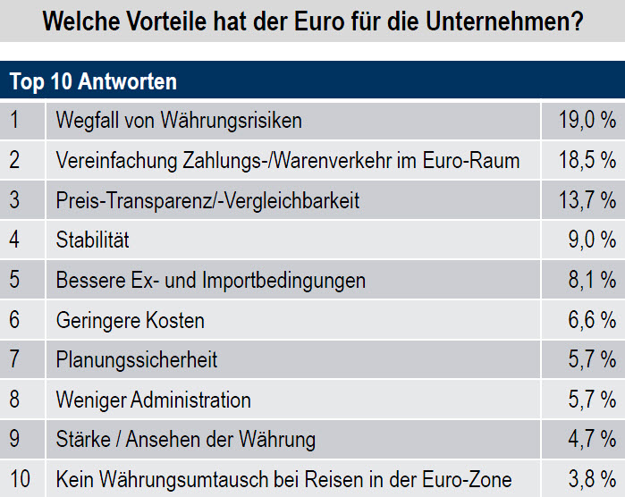 Interessant ist die Bewertung der deutschen Wirtschaft: Die Kienbaum Consultants International GmbH. Das Stuttgarter Unternehmen hat 250 Führungskräfte von Unternehmen aus verschiedenen Branchen befragt. Auf die Frage, welche Vorteile der Euro für die Unternehmen gebracht habe, gab eine Mehrheit von 19 Prozent den Wegfall von Währungsrisiken an. Auffällig: Die Antwort „Bessere Ex- und Importbedingungen“ rangiert mit 8,1 Prozent nur an fünfter Stelle. Einen höheren Stellenwert haben für die Führungskräfte die Vereinfachung des Zahlungs- und Warenverkehrs im Euro-Raum (18,5 Prozent), die Preis-Transparenz und –Vergleichbarkeit (13,7 Prozent) sowie die Stabilität (9,0 Prozent).