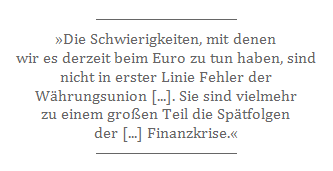 Als ich kürzlich meinen Bücherschrank ordnete, stieß ich ganz weit hinten auf die Festschrift der Europäischen Zentralbank zum zehnjährigen Bestehen der Währungsunion. Sie ist nunmehr neun Jahre alt und fast schon etwas vergilbt. Darin wird der Euro in beredten Worten und mit vielen statistischen Belegen als Erfolgsmodell dargestellt. Er hat, so heißt es darin, nicht nur für Geldwertstabilität gesorgt. Er hat auch "erheblich zum Funktionieren unseres großen kontinentalen Marktes [...] beigetragen".