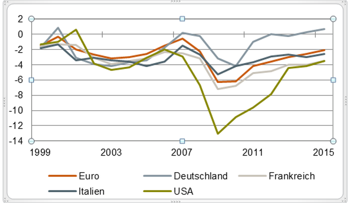 Die USA hatten in der Rezession ein noch größeres Defizit. Auch sie haben es seit 2010 kräftig zurückgeführt. Heute ist das Defizit der USA gemessen am BIP (3,5 %) aber immer noch größer als das des Euroraums (2,1 %).