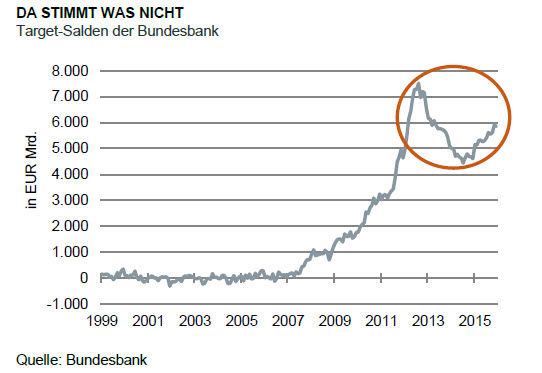 Aber jetzt passiert etwas, was gar nicht ins Bild passt. Trotz der äußerlichen Ruhe im Euro steigen die Salden wieder an. Seit eineinhalb Jahren haben sie sich um EUR 120 Mrd. erhöht. Zuerst konnte man das mit der Entwicklung in Griechenland und den Problemen der italienischen Banken begründen. Aber jetzt reicht diese Erklärung nicht mehr aus. Denn die Entwicklung geht ungebremst weiter. Seit März 2015 nehmen die Target-Salden pro Monat im Schnitt um EUR 7 Mrd. zu. Das ist so wie wenn Deutschland seinen Partnerländern jeden Monat einen Kredit dieser Höhe gäbe.
