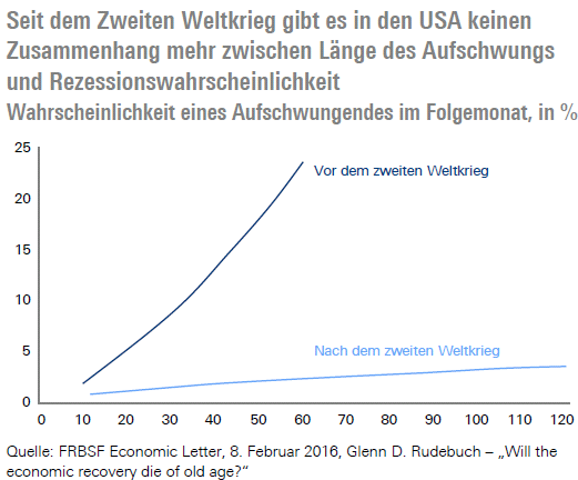 Derzeit herrscht an den Finanzmärkten das Gefühl vor, dass die Expansion der US-Wirtschaft schon weit fortgeschritten und es daher nur eine Frage der Zeit ist, bis die nächste Rezession kommt. Interessanterweise gab es diesen Zusammenhang vor dem Zweiten Weltkrieg, als die Rezessionswahrscheinlichkeit mit zunehmender Länge des Aufschwungs wuchs und die Rezessionswahrscheinlichkeit nach einem Aufschwung von 60 Monaten schon bei knapp 25 % lag. Seit dem Zweiten Weltkrieg ist dieser Zusammenhang auf Basis rein statistischer Berechnungen jedoch nicht mehr zu beobachten.