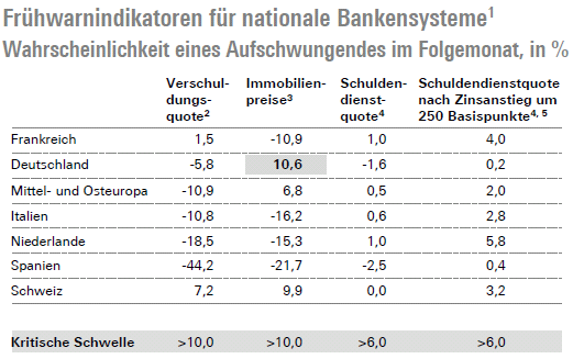 Dabei ist nach den Erkenntnissen der BIZ nicht das Verschuldungs- oder Immobilienpreisniveau an sich entscheidend, sondern die Abweichung vom langfristigen Trend. Immer nur dann, wenn die Kredite und Immobilienpreise in kurzer Zeit stark steigen, werden dementsprechend Warnsignale generiert. So sind die inflationsbereinigten deutschen Immobilienpreise auf ein Niveau von über 10 % des langfristigen Durchschnitts gestiegen. Aber auch die Schweiz scheint mit einer Abweichung von knapp 10 % vom langfristigen Durchschnitt von einer Immobilienpreisblase betroffen zu sein.