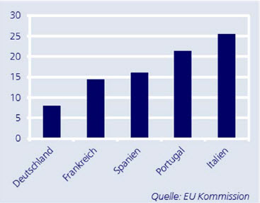 Neben den inflatorischen Wirkungen gingen von einer Euroabwertung vor allem auch wachstumsfördernde Effekte aus. Denn aufgrund des gesunkenen Wechselkurses würden Güter, die im Euroraum erzeugt werden, auf den Auslandsmärkten billiger. Dadurch steige die Nachfrage und damit auch die Exporte. „Allerdings muss berücksichtigt werden, dass in einer arbeitsteiligen Wirtschaft eine Zunahme der Exporte meist auch höhere Importe in Form von Vorleistungen und Rohstoffen nach sich zieht“, gibt Bargel zu bedenken. Je höher der Anteil der zur Herstellung der Exporte benötigten importierten Vorleistungen ist, desto geringer sei der Wachstumseffekt einer Währungsabwertung, da sich der Außenbeitrag dann weniger stark verbessere. „Deutschland befindet sich mit einem Anteil von 27 Prozent im Mittelfeld der EWU-Länder. In Frankreich, Italien und Spanien liegt der Anteil etwas niedriger, so dass der Wachstumseffekt einer Abwertung tendenziell etwas höher ausfällt.“