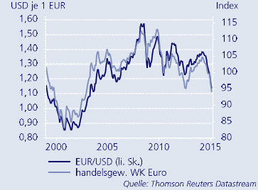Dank der Euro-Abwertung konnte die deutsche Wirtschaft leicht wachsen. Und der Fall der Gemeinschaftswährung dürfte aufgrund unterschiedlicher Zentralbankpolitik noch einige Zeit weiter gehen.