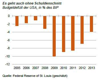 Wachstum im privaten Sektor ist es, auf was die USA nach dem Zweiten Weltkrieg gesetzt haben, als sie binnen 20 Jahren die Schuldenquote von 120 % auf unter 40 % senkten. Sie tun das auch jetzt wieder. Durch die Sparmaßnahmen zu Beginn des Jahres (Erhöhung der Steuern, Kürzung der Ausgaben) ist es gelungen, die Defizitquote seit 2011 überraschend schnell von 8,6 % auf 4 % zu halbieren (siehe Grafik) und trotzdem die Arbeitslosigkeit zu verringern. Die USA haben nicht über Austerität geredet, sie haben sie gemacht. Vor allem haben sie erreicht, dass Banken und Industrie wieder wettbewerbsfähig wurden.