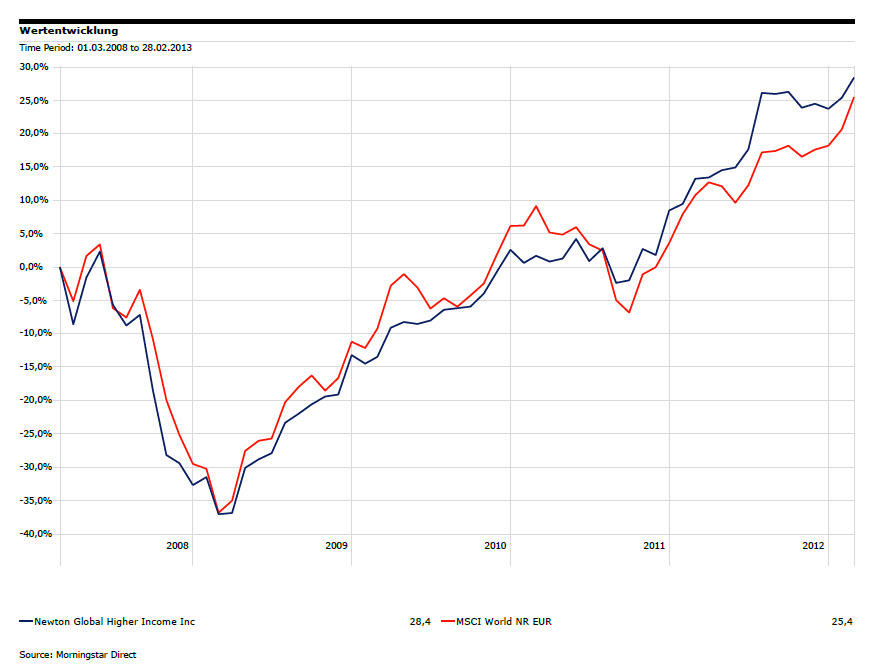 Seinem Fonds Newton Global Higher Income (ISIN: GB00B0MY6T00) scheint dies alles nichts anhaben zu können: Für die vergangenen fünf Jahre steht ein Plus von 28,37 Prozent und für die vergangenen drei Jahre von 48,33 Prozent. Die Auswirkungen des politischen Handelns treffen den im November 2005 aufgelegten Fonds augenscheinlich nicht. Im Jahr 2008, als die Krise einsetzte, verlor der 2,2 Milliarden Euro starke Fonds aber auch etwa 37 Prozent seines Wertes. Seitdem geht es wieder bergauf. Mit einer Dreijahresvolatilität von 8,55 Prozent ist der Global Higher Income sehr risikoarm. Die Sharpe Ratio von 1,48 bringt ihn in der FINANZEN FundAnalyzer (FVBS)-Peergroup „Aktienfonds international“ weit nach vorne.
