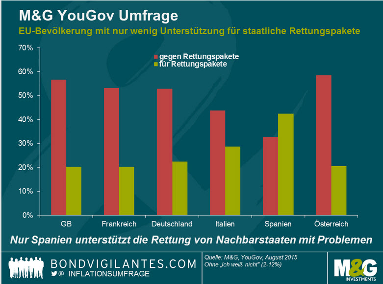 Es ist keine Überraschung, dass es in Großbritannien, wo die Anti-Europa-Partei UKIP in den Parlamentswahlen 13% erhalten hat und wo für Ende 2017 eine Volksbefragung über einen möglichen EU-Austritt geplant ist, erheblichen Widerstand gegen stattliche Rettungspakete gibt, für die der britische Steuerzahler haftet. Der größte Widerstand gegen staatliche Rettungspakete in der EU findet sich allerdings in Österreich. In Frankreich und Deutschland sperrt sich ebenfalls eine Mehrheit gegen das Konzept. Die beiden Staaten mit den höchsten Staatsschulden, Italien und Spanien, sind der Hilfe für andere Staaten in wirtschaftlichen Schwierigkeiten mehr aufgeschlossen. In Spanien stimmten 43% für staatliche Rettungspakete – bei Weitem die stärkste Unterstützung – und nur 33% – die niedrigste Prozentzahl – gegen finanzielle Hilfen. Diese Ergebnisse schließen „Ich weiß nicht”-Antworten aus. Sie reichen von 2% in Österreich bis zu 12% in Großbritannien. Der Rest der Befragten in jedem Land gab an, finanzielle Rettungspakete weder zu unterstützen noch abzulehnen (nicht in der Graphik dargestellt).