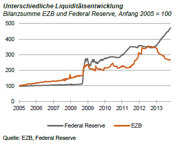 Drittens ist in Europa nur das tatsächliche Zentralbankgeld zurückgeführt worden, nicht aber die Liquidität im Sinne der jederzeitigen Verfügbarkeit von Geld. Die EZB hat den Banken im Gegenteil ausdrücklich zugesichert, dass sie alle Tender voll zuteilen würde, die Banken also weiter Geld zu praktisch Nullzinsen bekommen können. Das wäre in den USA beim Tapering nicht der Fall. Wenn die Federal Reserve keine Wertpapiere mehr kauft, bekommen die Banken weniger Mittel. Insofern ist die amerikanische Politik einschneidender.