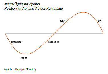Im Augenblick sieht es so aus. Manchmal hat man in der Tat den Eindruck, als habe sich die Welt gegen Europa verschworen. Auf einmal scheint alles schief zu gehen. In der letzten Woche hat der Internationale Währungsfonds seine neue Prognose über die Entwicklung der Weltwirtschaft vorgelegt. Danach wachsen die Vereinigten Staaten in diesem Jahr mit 3,6 % fast drei Mal so schnell wie Deutschland (1,3 %) oder der Euroraum (1,2 %). Im Konjunkturzyklus hinken die Europäer weit hinter den USA her (siehe Grafik).