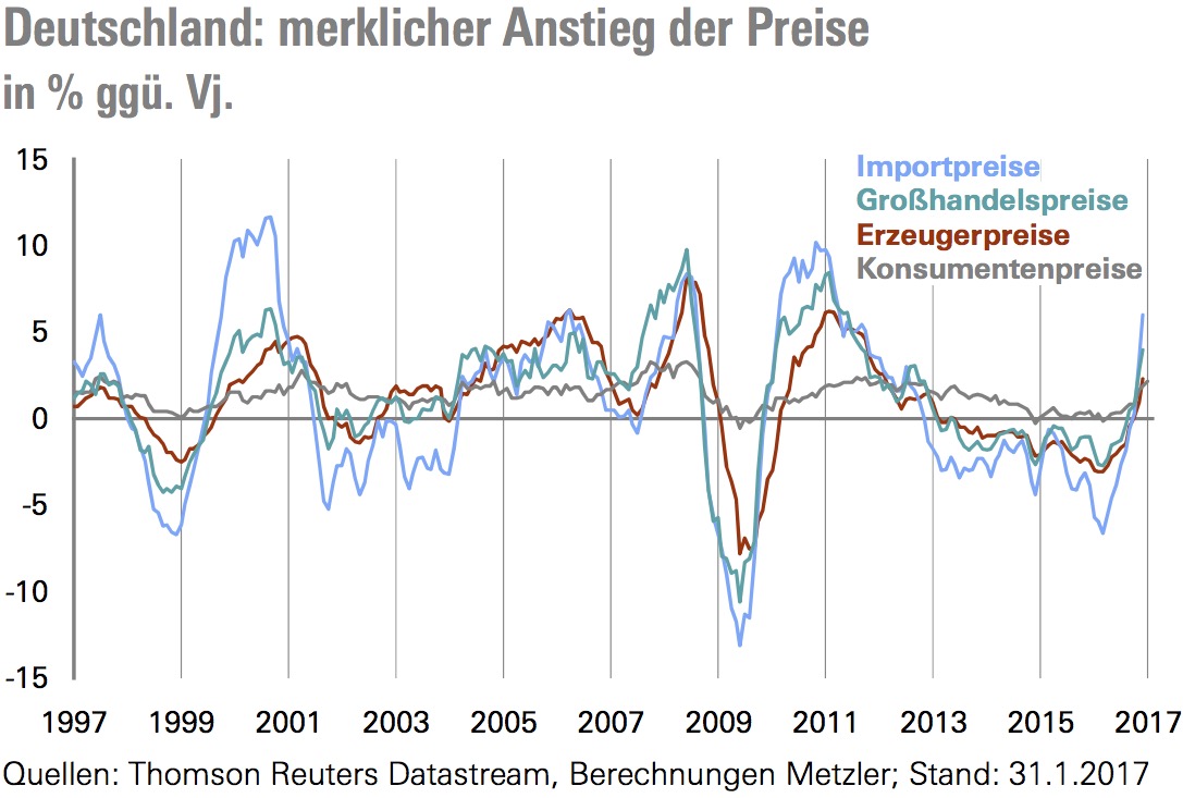EZB-Präsident Draghi begründete die umfassende Lockerung der Geldpolitik im März vergangenen Jahres mit zu hohen Deflationsrisiken. Nur 10 Monate später hat sich das Bild komplett gewandelt: Die deutsche Importpreisinflation ist von -6,6 % im April 2016 auf6,0 % im Januar 2017 gestiegen, die Großhandelspreisinflation von -2,7 % auf 4,0 %; die Erzeugerpreisinflation von -3,1 % auf 2,4 % und die Konsumentenpreisinflation von -0,1 % auf 2,2 % im Februar 2017.Sicherlich ist der Ölpreisbasiseffekt maßgeblich dafür verantwortlich. Der merkliche Anstieg der Frühindikatoren Importund Großhandelspreise signalisiert jedoch wie schon oft in der Vergangenheit, dass auch die Kerninflation bald wieder steigen und sich die Inflation in der Eurozone in den kommenden Monaten zwischen 1,5 % und 2,0 % bewegen dürfte.