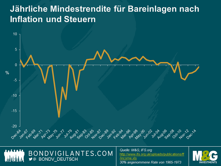 Nehmen wir den Zinssatz der Bank of England als Hinweis auf den Zinsertrag aus flüssigen Mitteln und berücksichtigen die Inflation (d.h. Leitzins minus VPI), so wird deutlich, dass negative Nominalzinsen zwar ein neues Phänomen sind, nicht aber reale Negativzinsen. Wenn wir diese Idee erweitern und die historische Standardbasiseinkommenssteuer mit hinzunehmen, so nähern wir uns einer Rate, die als die reale Mindestrendite für Bareinlagen angenommen werden kann. Alles in allem eine genauere Abbildung des realen verfügbaren Einkommens, das Sparer tatsächlich über ein Jahr erhalten haben. Der folgenden Grafik ist denn auch zu entnehmen, dass diese Zahl über die letzten zehn Jahre in Großbritannien negativ war.