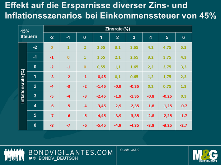 Der Fokus auf Extreme und den Höchststeuersatz von 45% in der folgenden Grafik hilft, die Realrendite für Sparer unter verschiedenen Zins-und Inflationsszenarios zu veranschaulichen. Wie zu erwarten, sind hohe Nominalzinssätze und eine niedrige Inflation unter allen Steuerszenarios für Sparer vorteilhaft.