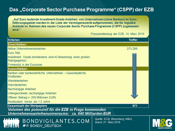 Die Anleihemärkte haben auf das am 10. März bekanntgegebene neue „Corporate Sector Purchase Programme“ (CSPP) der Europäischen Zentralbank (EZB) zum Ankauf von Unternehmensanleihen heftig reagiert. Die Credit Spreads der auf Euro lautenden Unternehmensanleihen mit Investment-Grade-Status (IG) haben sich durchschnittlich um rund 20 BP verringert. Über die Einzelheiten des CSPP wird jedoch noch gerätselt. Die Veröffentlichung des Berichts über die letzte Sitzung des Geldpolitischen Ausschusses von gestern hat kaum für Klarheit gesorgt. Bisher wissen wir lediglich, dass die EZB ab Ende des 2. Quartals 2016 damit beginnen wird, auf Euro lautende Unternehmensanleihen mit IG-Status von Nichtbanken mit Sitz in der Eurozone anzukaufen. Die EZB hat außerdem erklärt, dass Anleihen, die die Kriterien des Sicherheitenrahmens des Eurosystems erfüllen, die „Grundlage“ des CSPP-Universums bilden, es könnten aber weitere Regeln und Vorgaben gelten.
