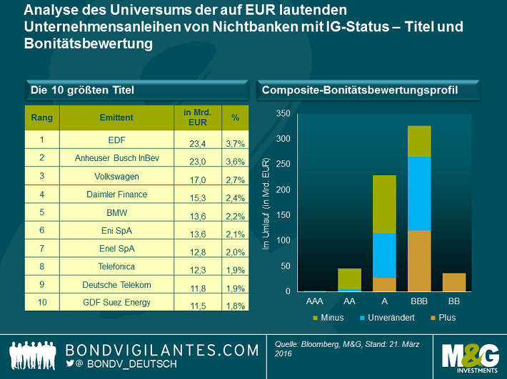 Bonitätsbewertung: Wir haben alle Unternehmensanleihen aufgenommen, die mindestens von einer der drei großen Ratingagenturen (Moody’s, S&P und Fitch) eine IG-Bewertung erhalten haben. Dieser Rahmen könnte zu großzügig sein, da Crossover-Titel bzw. „Fallen Angels“ mit erfasst werden, deren Rating nicht dem IG-Status entspricht, so lange ihr bestes Rating BBB- oder höher ist. Oder aber er könnte zu eng gezogen sein, da die EZB bei ihrem Sicherheitsrahmen auch Bonitätsbewertungen von DBRS als vierte externe Agentur akzeptiert.