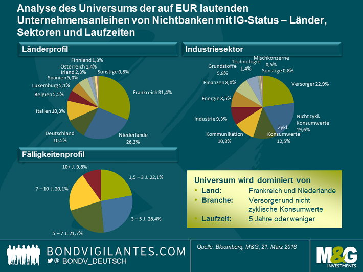 Aus Ländersicht wären französische Unternehmen die größten Nutznießer (31,4%), wie wir bereits 2014 vorhergesagt hatten (siehe Blog von Anjulie). Die Niederlande (26,3%), die davon profitieren, dass dort sehr viele Holdinggesellschaften domiziliert sind, und Deutschland (10,5%) stehen an zweiter bzw. dritter Stelle. Versorgungsunternehmen (22,9%) werden wohl der dominante Industriesektor sein, noch vor nicht zyklischen (19,6%) bzw. zyklischen Konsumwerten (12,5%). Die Duration von auf EUR lautenden Unternehmensanleihen mit IG-Status ist relativ kurz verglichen mit der von auf USD lautenden IG-Titeln. Daher überrascht es nicht, dass etwa die Hälfte der Titel in unserem potenziell in Frage kommenden Universum (48,5%) innerhalb von 5 Jahren fällig wird.