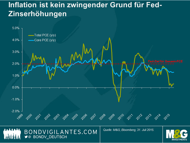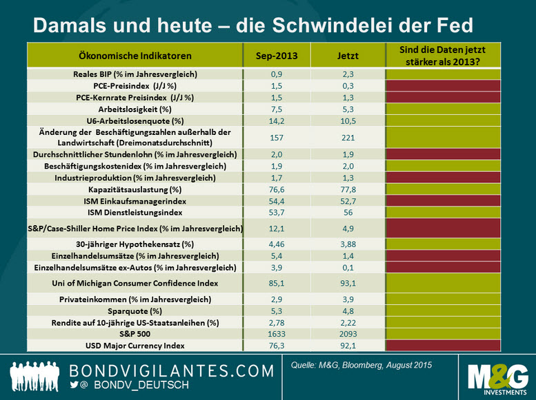 Der Blick auf einige volkswirtschaftliche Datenpunkte zeigt, dass die US-Konjunktur im Vergleich zum September 2013 auf einer stabileren Grundlage steht. Das Wachstum ist solide, die Arbeitslosigkeit niedrig, das Verbrauchervertrauen höher, und das Institue of Supply Management (ISM) deutet an, dass mit weiterem Wirtschaftswachstum zu rechnen ist. Verfechter einer Zinserhöhung sehen sich nicht nur mit einer deutlich niedrigeren Inflation und stagnierenden Einzelhandelsumsätzen konfrontiert, sondern müssen ebenfalls akzeptieren, dass der US-Dollar für längere Zeit den US-amerikanischen Unternehmen Probleme bereiten wird. Hinzu kommt, dass das globale Konjunkturumfeld nicht nur angesichts der Sorgen um das chinesische Wirtschaftswachstum und die damit assoziierte Schwäche der Schwellenmärkte schwächer ist als noch 2013, sondern ebenfalls durch die Ansteckungsrisiken der griechischen Probleme in Europa und ein potenzielles Referendum 2016 über die Zukunft Großbritanniens in der EU belastet wird.