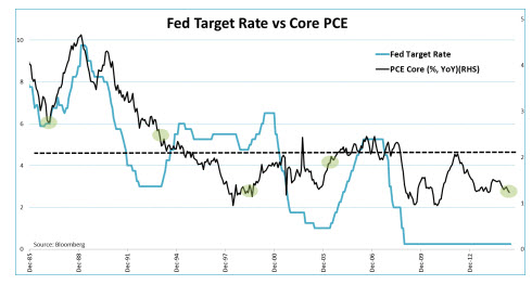 The graph below shows the level of the Fed Target Rate (on the left axis) and Core PCE Index (on the right axis.) Since the peak in inflation during the ‘70s, inflation levels have been trending down. This trend is, to some extent, mirrored by the Core PCE levels at which the Fed started hiking rates (green circles.) This makes the average Core PCE level perhaps a little bit less informative. An important take away, however, is, that in 1999 the hiking cycle took off at the same depressed level of Core CPE as the one we have currently…