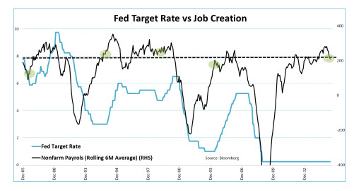 The graph below shows the level of the Fed Target Rate (on the left axis) and job growth (on the right axis.) By looking at the number of jobs created we can circumvent issues like unemployment definitions, participation rates, and so on. The graph reveals that, with the exception of the hiking cycle that began in 1986, the level of job creation at which the Fed starts hiking rates is pretty similar. On top of that, the average of 210K jobs per month exactly matches the level of current job growth…
