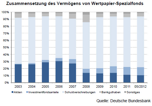 Bei den Wertpapier-Spezialfonds hat sich in den vergangenen Jahren der Anlageschwerpunkt stark verändert. In den Jahren 2003 bis 2007 pendelte die Aktienquote zwischen 25 und 30 Prozent. Seit dem Markteinbruch im Jahr 2008 verharrt sie bei gut 10 Prozent. In diesen beiden Perioden mit tendenziell steigenden Kursen haben Fondsmanager Aktien verkauft, da die Aktienquote nahezu konstant blieb.