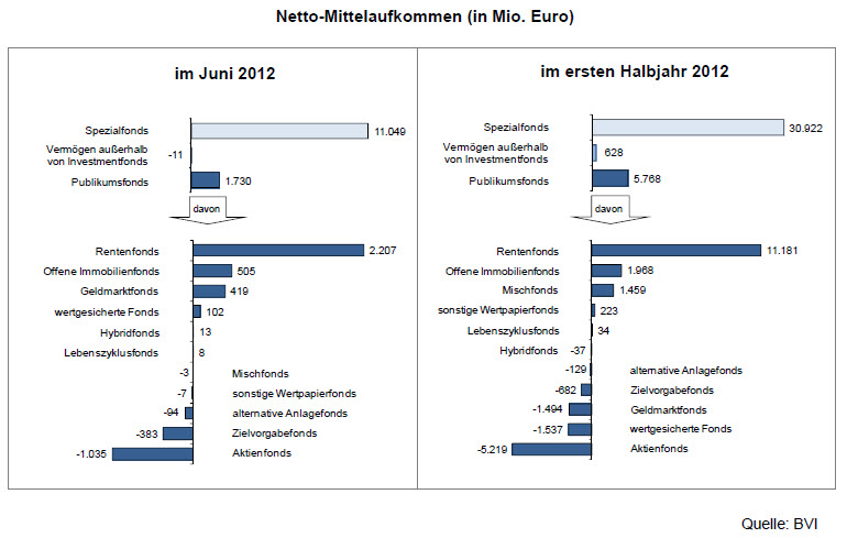 Investmentfonds erlebten im Juni 2012 kräftige Zuflüsse von 12,8 Mrd. Euro. In Spezialfonds strömten 11,0 Mrd. Euro. Auch Publikumsfonds waren mit 1,7 Mrd. Euro gefragt. Bei den Vermögen außerhalb von Investmentfonds lag der Nettoabsatz nah an der Nulllinie. Im ersten Halbjahr haben institutionelle Anleger, wie zum Beispiel Versicherungen und Pensionskassen, per Saldo 30,9 Mrd. Euro in Spezialfonds investiert. Das ist knapp ein Drittel mehr als im Vergleichszeitraum des Rekordjahres 2010. Der Großteil entfällt mit 29,5 Mrd. Euro auf Wertpapier-Spezialfonds. Weitere 1,4 Mrd. Euro haben die Profis in Immobilien-Spezialfonds angelegt.