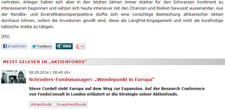 Lesern, denen ein FundResearch-Beitrag gefallen hat, können diesen nun „empfehlen“. Am Ende eines jeden Artikels befinden sich Buttons, mit denen der Beitrag in Sozialen Netzwerken geteilt werden kann. Facebook, Twitter, Xing und Google+ sind bisher vorgegeben.