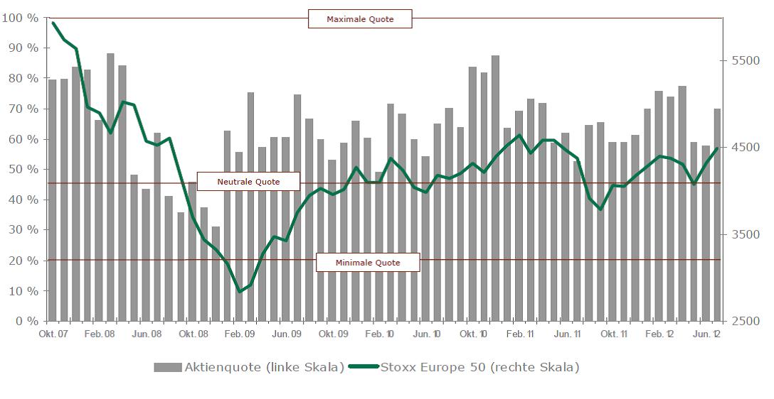 Um von der Volatilität der Märkte zu profitieren, hat FRANKFURT-TRUST im Oktober 2007 den BHF Flexible Allocation FT aufgelegt. Das Ziel ist die hohe Partizipation an der Aufwärtsbewegung des Aktienmarktes sowie die Verlustbegrenzung in Abwärtsphasen. Den Aktienanteil des Fonds kann das Fondsmanager-Team um Dr. Manfred Schlumberger flexibel steuern: „Die Schlacht wird gewonnen durch die richtige Aktienquote“, ist Scarfone überzeugt. Die Bandbreite für Aktien liege zwischen 20 und 100 Prozent. Derzeit (Stand: 31. Juli 2012) hält der Fonds einen Aktienanteil von 63,1 Prozent. Der Anlageschwerpunkt sei zwar Europa, aber „unsere Spielwiese ist die ganze Welt“, so der Vertriebsleiter. Um die Aktienquote erfolgreich zu steuern, gebe es verschiedene Faktoren. „Die Kunst ist, je nach Marktphase die richtigen Indikatoren in die Strategie einfließen zu lassen“, so Scarfone. Monetäre, volkwirtschaftliche, marktpsychologische und Bewertungsindikatoren wirken sich auf die Steuerung des Aktienanteils aus. In den vergangenen Jahren hätten vor allem die monetären Indikatoren dominiert. Doch Scarfone warnt davor, ausschließlich auf die Fundamentaldaten zu schauen. Den aktuellen Marktanstieg könne man dadurch beispielsweise nicht erklären. Dass jedoch nicht alles im Voraus planbar ist, musste auch das Management des Fonds schmerzvoll erfahren: „Während der Lehman-Pleite waren wir zunächst zu hoch in Aktien investiert“, räumt Scarfone ein. „Aber wir haben schnell daraus gelernt und danach die Aktienquote drastisch gesenkt.“ Eine allgemeingültige Formel, wie die Aktienquote am besten gesteuert wird, gebe es natürlich nicht.