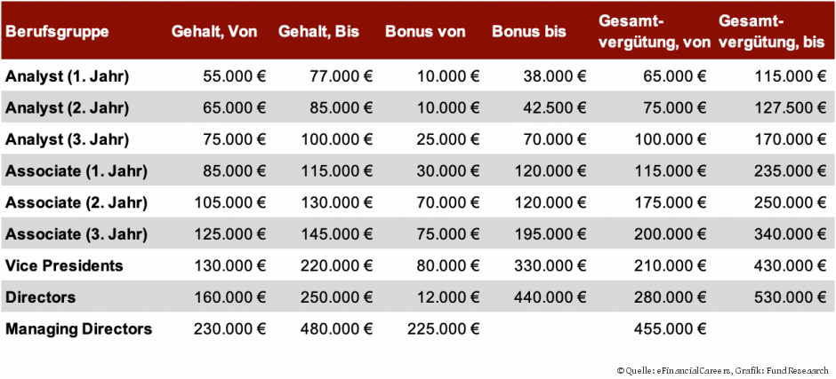 Während die Beförderung bei Analysten und Associates nach zwei oder drei Jahren mehr oder weniger automatisch erfolgt, ist dies ab dem Vice President-Level nicht mehr der Fall. Es gibt also auch Vice Presidents mit weit über zehn Jahren Berufserfahrung. Daher fällt die Gehaltsspanne hier mit 130.000 bis 220.000 Euro besonders hoch aus. Directors oder Executive Directors können mit Gehältern von 160.000 bis 250.000 und einem Bonus ab 120.000 Euro rechnen.