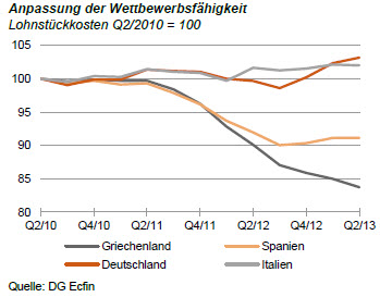 Entsprechend hat sich die Leistungsbilanz der Peripheriestaaten verbessert. Sowohl Griechenland als auch Spanien hatten in den ersten sieben Monaten 2013 kein Defizit mehr. Vor einem Jahr hatten sie noch erhebliche Fehlbeträge.