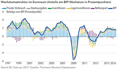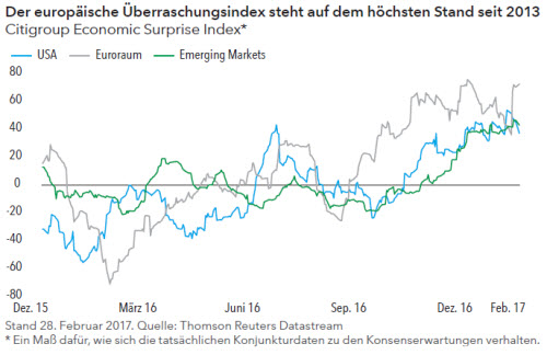 Auch wenn die Capital Group auf Unternehmen und nicht auf Volkswirtschaften setzt, kann eine gute Konjunktur nicht schaden. Seit vielen Monaten hat die Euroraum-Wirtschaft die Erwartungen übertroffen; sie war erfolgreicher als prognostiziert (vgl. Abbildung unten). Es gibt Anzeichen dafür, dass sich das europäische Wirtschaftswachstum verbessert, wegen der expansiven Geldpolitik und der extrem niedrigen Zinsen. Der Euroraum mit seinen 19 Mitgliedern hat sich seit der Rezession 2012/2013 stark erholt. Der Euroraum-Einkaufsmanagerindex, ein guter Indikator für das zukünftige Wirtschaftswachstum, signalisiert für die kommenden Monate sogar noch mehr Wachstum. 2016 ist das Euroraum-BIP um 1,7% gestiegen (vgl. erste Abbildung auf Seite 4) und damit etwa so stark wie das US-BIP. Erstmals seit der internationalen Finanzkrise hat der Euroraum mit den USA Schritt gehalten.