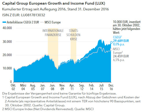Bei der Capital Group interessieren uns vor allem Einzelwertideen für interessante Unternehmen. Der Markt funktioniert aber manchmal anders. Während wir das Anlageuniversum in erster Linie als eine Gruppe von Unternehmen ansehen, wird es an den Märkten oft als eine Einheit betrachtet und entsprechend investiert. Daher können wir mit unserem internationalen Ansatz attraktive Anlagemöglichkeiten finden, wo immer sie entstehen. Da andere Assetklassen immer höher bewertet erscheinen, können Anlagen in Europa nicht nur für Diversifikation sorgen, sondern auch interessant für Investoren auf der Suche nach günstig bewerteten, international erfolgreichen Unternehmen sein. Seit seiner Auflegung vor 15 Jahren sind sie der Schwerpunkt unseres European Growth and Income Fund (vgl. Abbildung unten).