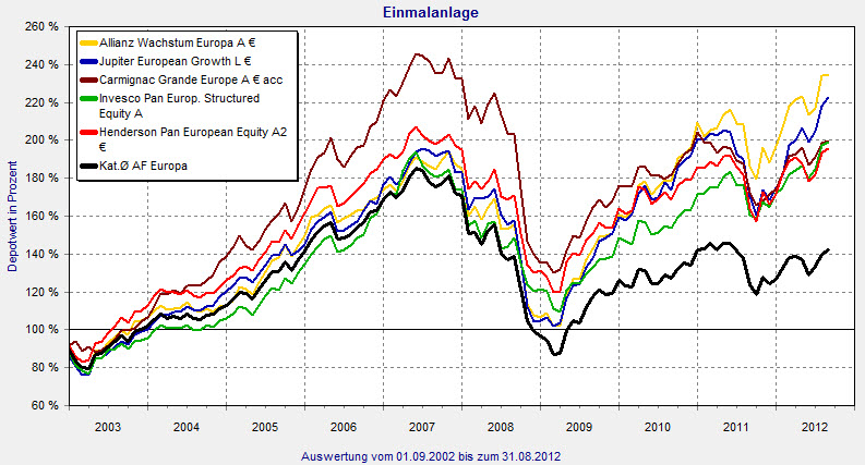 Platz vier geht an Invesco mit dem Invesco Pan European Structured Equity Fund (ISIN: LU0119750205). Der Fonds umfasst ein Gesamtvolumen von 952 Millionen Euro und hat die €uro-FondsNote 2. Die Fondsmanager Michael Fraikin und Thorsten Paarmann kommen in 2012 bisher auf ein Plus von 15,47 Prozent. Für die vergangenen drei Jahre schlägt ein Wertzuwachs von guten 49,65 Prozent zu Buche, im Zeitraum von zehn Jahren sind es 98,90 Prozent (7,12 Prozent p.a.). Der Fonds wurde im Juni 2002 aufgelegt. Die Gesamtgebühr ist mit 1,59 Prozent die niedrigste dieses Vergleichs. Die zehn-Jahres-Volatilität liegt bei 14,69 Prozent, die Sharpe Ratio von 0,37 bedeutet Rang fünf in der Peergroup.