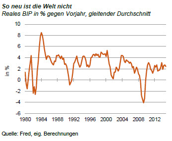 So sieht das die Federal Reserve aber offenbar nicht. Sie ist der Meinung, dass sich die Welt gar nicht so sehr verändert hat. Die Wirtschaft folgt nach wie vor den alten Gesetzen. Schauen Sie sich die Konjunktur an (siehe Grafik). Sie bewegt sich gar nicht viel anders als früher. Durch die Flutung der Märkte mit Geld in den letzten Jahren sind aber neue Ungleichgewichte entstanden. Sie sind so groß, dass man sie nicht als "neue Normalität" verharmlosen kann. Sie müssen beseitigt werden, und zwar so schnell wie möglich.