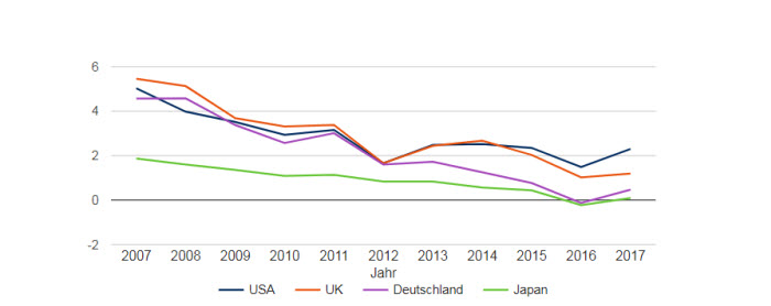 Quelle: Schroders, Thomson Reuters Datastream; Stand aller Daten: 30. Juni 2017. Daten für zehnjährige Staatsanleihen: US-Treasuries, britische Gilts, Bundesanleihen und japanische Staatsanleihen. Nur zu Informationszwecken. Es gilt zu beachten, dass die Wertentwicklung der Vergangenheit kein Hinweis für die Wertentwicklung in der Zukunft ist und sich möglicherweise nicht wiederholen lässt.