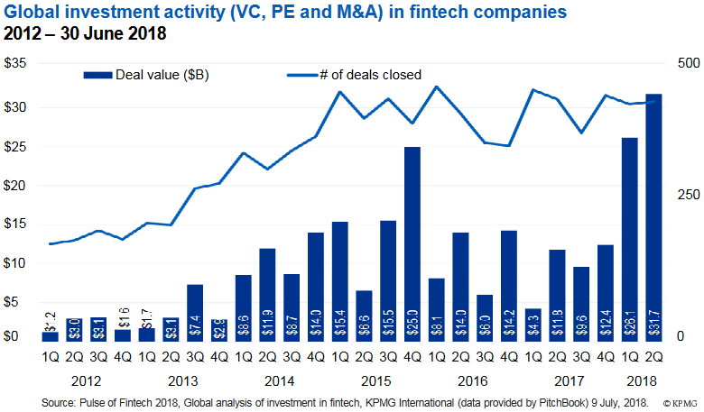 Die weltweiten Investitionen in Start-ups aus dem Finanzdienstleistungsbereich erreichen immer neue Höhen. So haben Wagniskapitalgeber allein im ersten Halbjahr 2018 rund 58 Milliarden Dollar in aufstrebende Fintechs gesteckt. Die Investitionen haben damit bereits die Summe des gesamten Jahres 2017 übertroffen (38,1 Milliarden Dollar). Das geht aus der aktuellen KPMG-Analyse “Pulse of Fintech” hervor, für die die weltweiten M&A-Deals und Finanzierungsrunden mit Fintechs im ersten Halbjahr 2018 ausgewertet wurden.