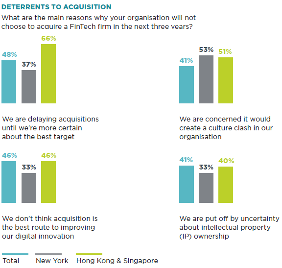 41 Prozent der Befragten tragen sich mit dem Gedanken, selbst ein FinTech zu gründen. Weitere 31 Prozent wollen innerhalb der kommenden 18 Monate ein FinTech-Start-up übernehmen. Dabei gibt es allerdings deutliche regionale Unterschiede: Während in New York rund 39 Prozent Banken und Asset Manager über Akquisitionen nachdenken, planen dies in Hongkong lediglich 21 Prozent der Befragten. In Frankfurt befassen sich 24 Prozent der Marktteilnehmer mit entsprechenden Übernahmen im FinTech-Bereich. Die 45 Prozent der Organisationen, die von FinTech-Übernahmen absehen, geben als Grund dafür vor allem regulatorische Risiken an.