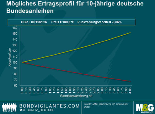 In der Vergangenheit stellten diese fehlenden Erträge den Vorteil von Anleihen gegenüber physischem Bargeld dar. Anleger entschieden sich gerne für die zusätzlichen Erträge und die möglichen Kapitalzuwächse und -verluste von Anleihen im Vergleich zu Barmitteln. Entwickelte Anleihenmärkte sind mittlerweile an einem Punkt angekommen, an dem die Erträge einer 10-jährigen deutschen Staatsanleihe und einem 100-Euro-Schein absolut identisch sind (Null) und der Renditevorteil für das Halten einer 10-jährigen Bundesanleihe verschwunden ist. Die potenziellen Kapitalzuwächse und -verluste, die sich durch das Halten einer Bundesanleihe ergeben können, existieren allerdings nach wie vor. Aufgrund des gegenwärtig niedrigen Renditeniveaus bin ich der Auffassung, dass das Aufwärtspotenzial für Bundesanleihen im Vergleich zu Barmitteln begrenzt ist.